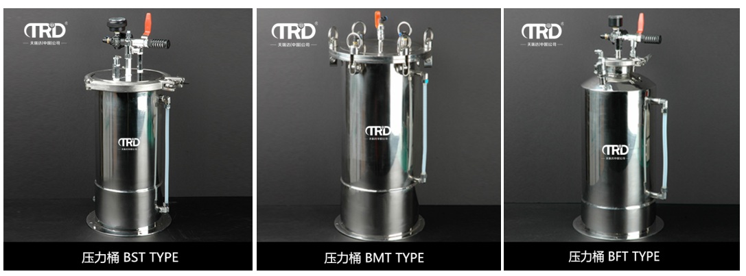BMT TYPE壓力桶專業用在大點膠量的場合,對保持點膠閥系統點膠的精確度非常重要。每個液料壓力桶都配有精密恒壓調壓閥,維持從壓力桶至點膠閥的流體壓力。液料壓力筒的開關是簡單的夾緊方式,結構上內部面和下部面相同,可以使用內部容器。使用時可將膠水原包裝直接放入桶內,用完無需清洗,維護方便